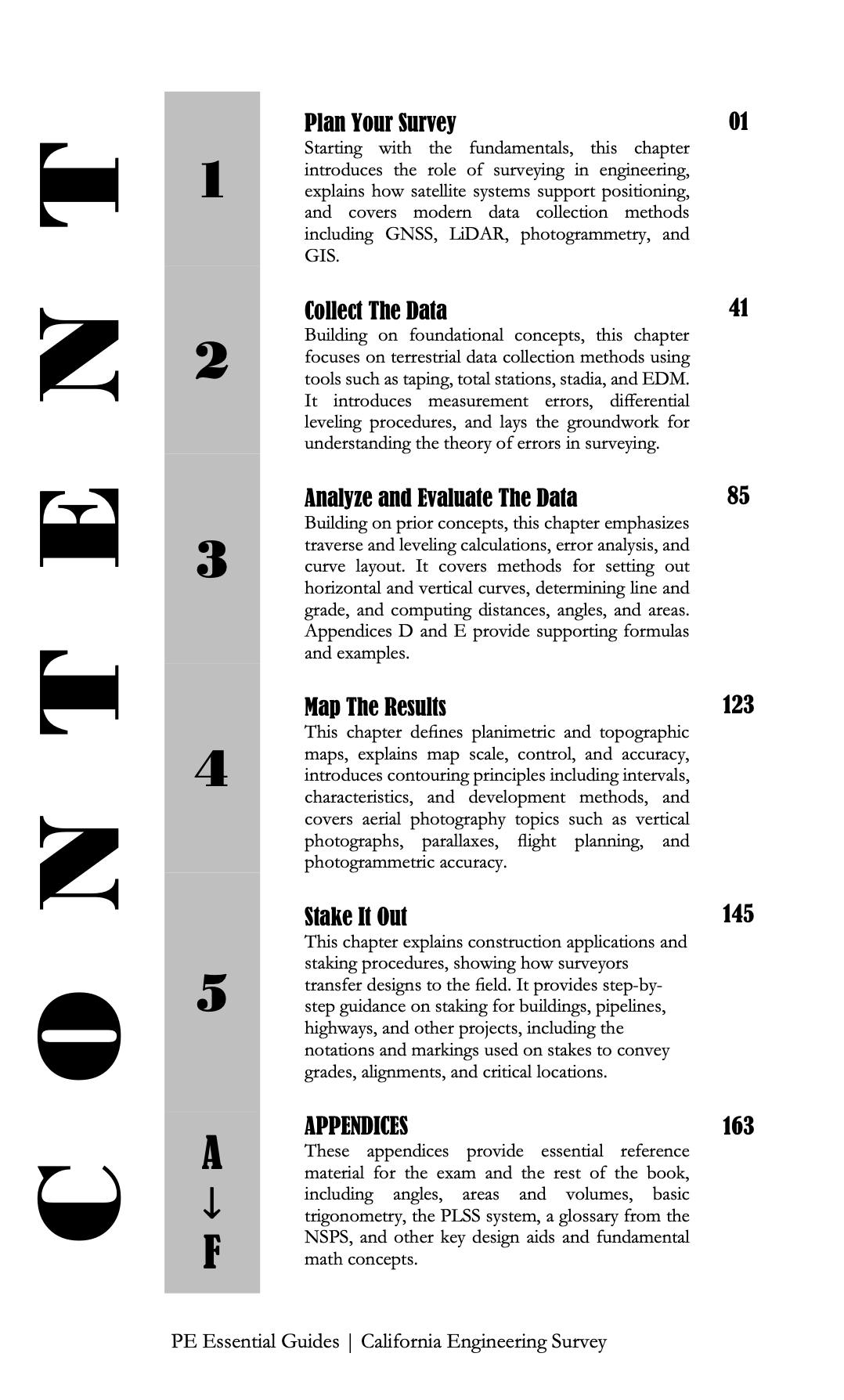 This book is designed to provide you with a comprehensive understanding of the theory and practical applications of engineering surveying, even if you have limited prior experience in the subject. Its purpose is to help you effectively prepare for and pass the California Engineering Surveying exam. It includes customized reference tables covering key formulas, unit conversions, and surveying standards commonly required during the test. Numerous diagrams and sketches are provided to illustrate field scenarios, mapping principles, and problem-solving approaches, while concise summaries highlight essential rules and procedures.