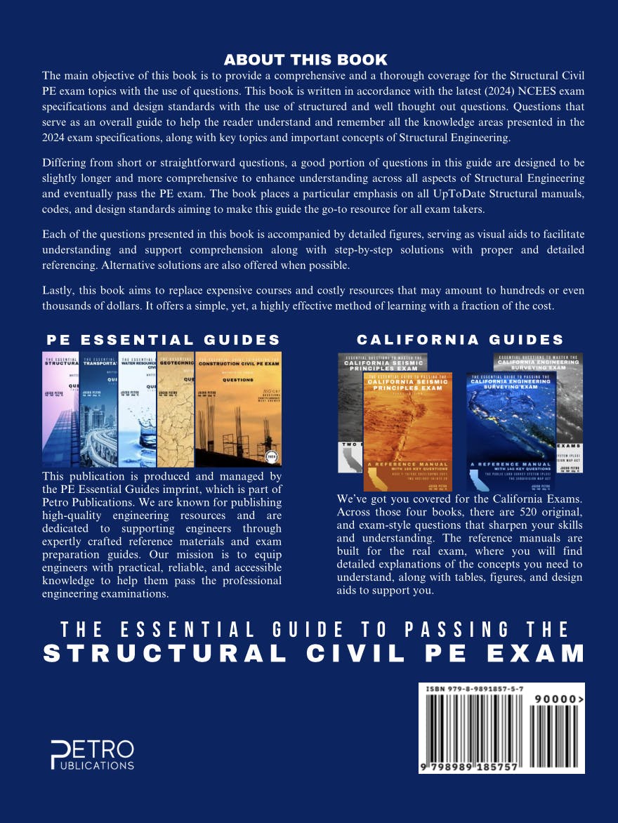 The main objective of this book is to provide a comprehensive and a thorough coverage for the Structural Civil PE exam topics with the use of questions. This book is written in accordance with the latest (2024) NCEES exam specifications and design standards with the use of structured and well thought out questions. Questions that serve as an overall guide to help the reader understand and remember all the knowledge areas presented in the 2024 exam specifications, along with key topics and important concepts of Structural Engineering.